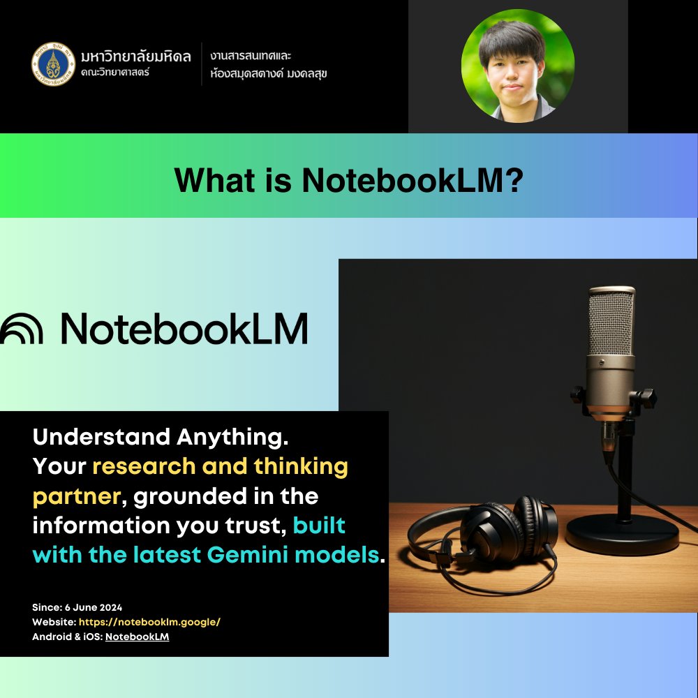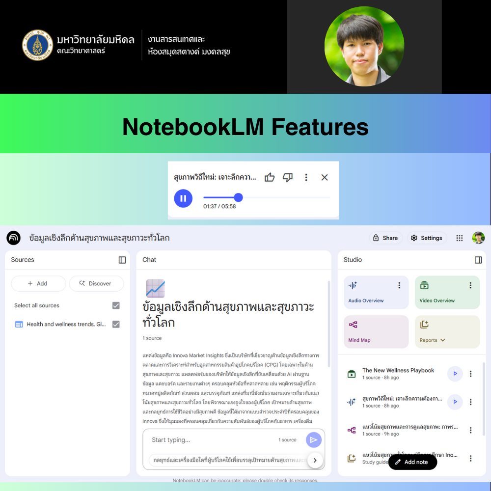 เมื่อวันที่ 13 สิงหาคม 2568 งานสารสนเทศและห้องสมุดสตางค์ มงคลสุข จัดกิจกรรมในรูปแบบ Online หัวข้อ "สรุปเนื้อหา วิเคราะห์ข้อมูล และทำ Podcast ด้วย NotebookLM" วิทยากรโดย คุณเฉลิมพันธุ์ ตาทิพย์ ตำแหน่งบรรณารักษ์ เพื่อแนะนำการใช้งาน NotebookLM (Google) แพลตฟอร์ม Generative AI สำหรับจัดการข้อมูลอย่างมีประสิทธิภาพ ช่วยให้สรุปข้อความจากเอกสารหรือโน้ตได้อย่างรวดเร็ว วิเคราะห์และถ่ายทอดประเด็นสำคัญเป็นแผนภาพความคิด (Mind Map) ได้ภายในไม่กี่นาที และเปลี่ยนข้อมูลให้กลายเป็น Podcast พร้อมใช้งานได้ทันที มีผู้สนใจเข้าร่วมกิจกรรม 54 ท่าน