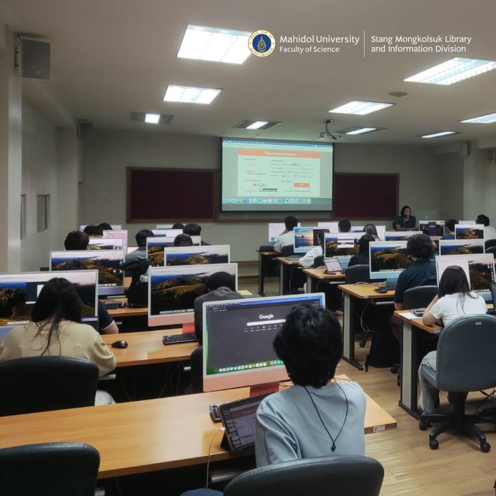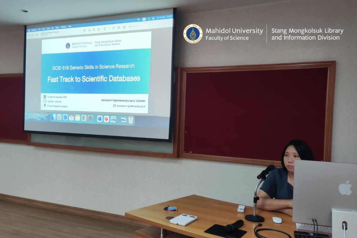 เมื่อวันที่ 12 และ 16 ธันวาคม 2568 เวลา 13.00-15.00 น. คุณกนกพร งามสว่างรุ่งโรจน์ พร้อมทีมบรรณารักษ์ห้องสมุดสตางค์ มงคลสุข เป็นวิทยากรพิเศษในการบรรยายและฝึกปฏิบัติ หัวข้อ "Fast Track to Scientific Databases" (บรรยายภาษาอังกฤษ) เพื่อการค้นหาข้อมูลในฐานข้อมูลทางวิทยาศาสตร์อย่างมีประสิทธิภาพ ประกอบรายวิชา SCID518 Generic Skills in Science Research ประจำภาคการศึกษาต้น ปีการศึกษา 2568 สำหรับนักศึกษาระดับบัณฑิตศึกษาของคณะวิทยาศาสตร์และหลักสูตรร่วมกับคณะวิทยาศาสตร์ (หลักสูตรนานาชาติ) จำนวน 92 คน ณ ห้องปฏิบัติการคอมพิวเตอร์ (P114) ชั้นหนึ่ง ตึกฟิสิกส์