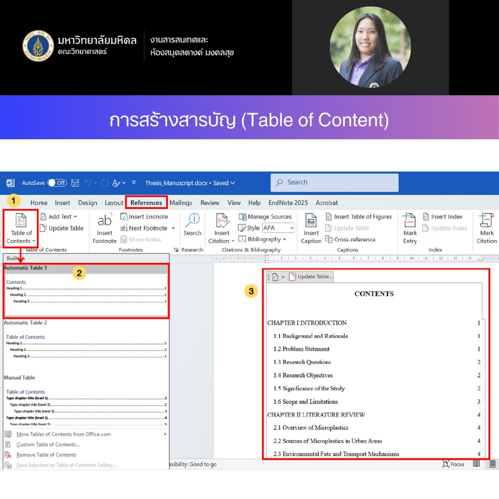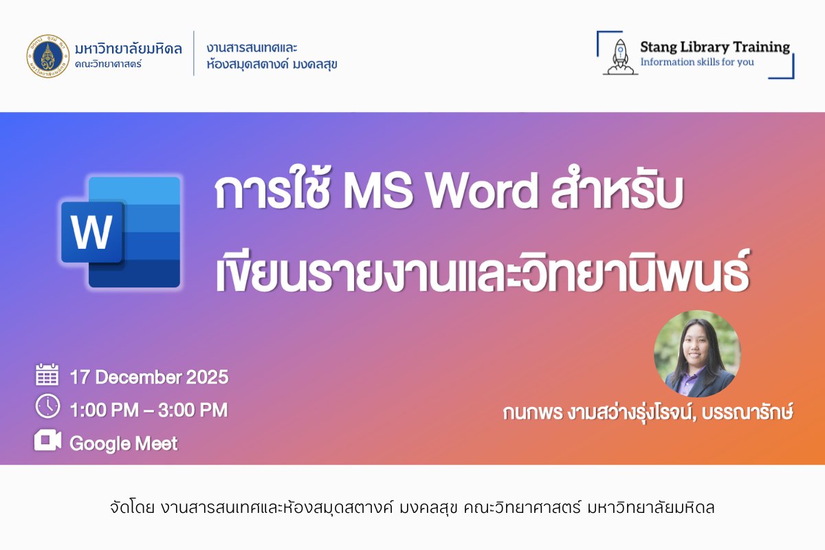 เมื่อวันที่ 17 ธันวาคม 2568 งานสารสนเทศและห้องสมุดสตางค์ มงคลสุข จัดกิจกรรมในรูปแบบ Online หัวข้อ "การใช้ MS Word สำหรับเขียนรายงานและวิทยานิพนธ์ รุ่นที่ 6" วิทยากรโดย คุณกนกพร งามสว่างรุ่งโรจน์ ตำแหน่งบรรณารักษ์ เพื่อแนะนำการใช้โปรแกรม MS Word จัดรูปแบบรายงาน วิทยานิพนธ์ หรือเอกสารอื่น ๆ อย่างมีประสิทธิภาพ โดยใช้ข้อกำหนดวิทยานิพนธ์ของบัณฑิตวิทยาลัย มหาวิทยาลัยมหิดล เป็นตัวอย่าง มีผู้สนใจเข้าร่วมกิจกรรม 99 ท่าน