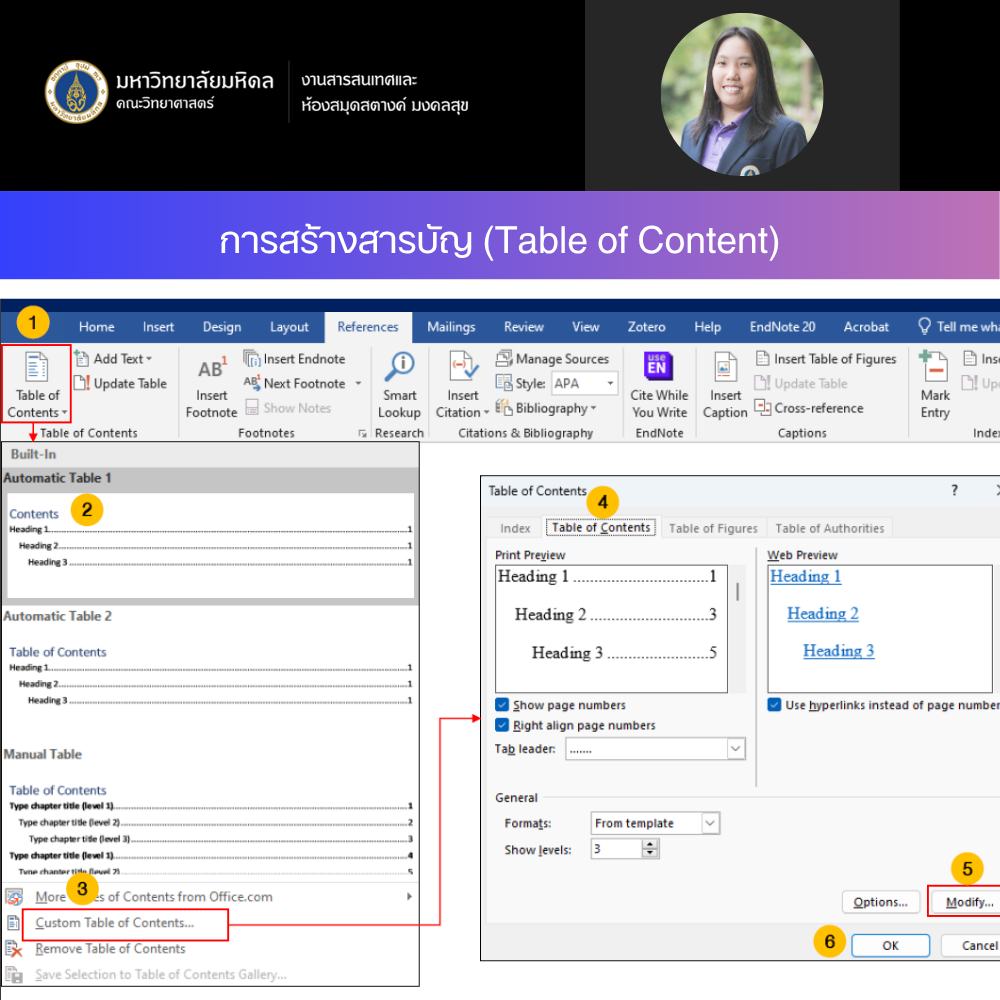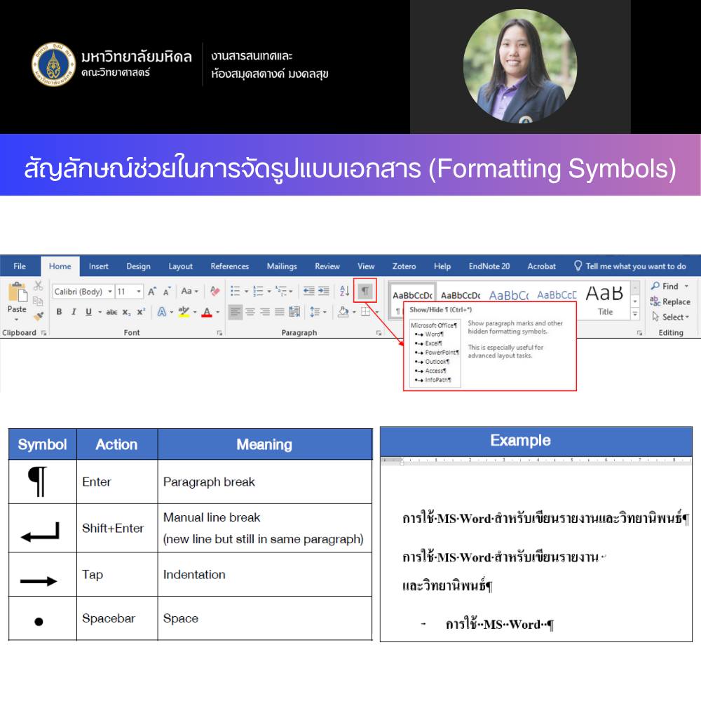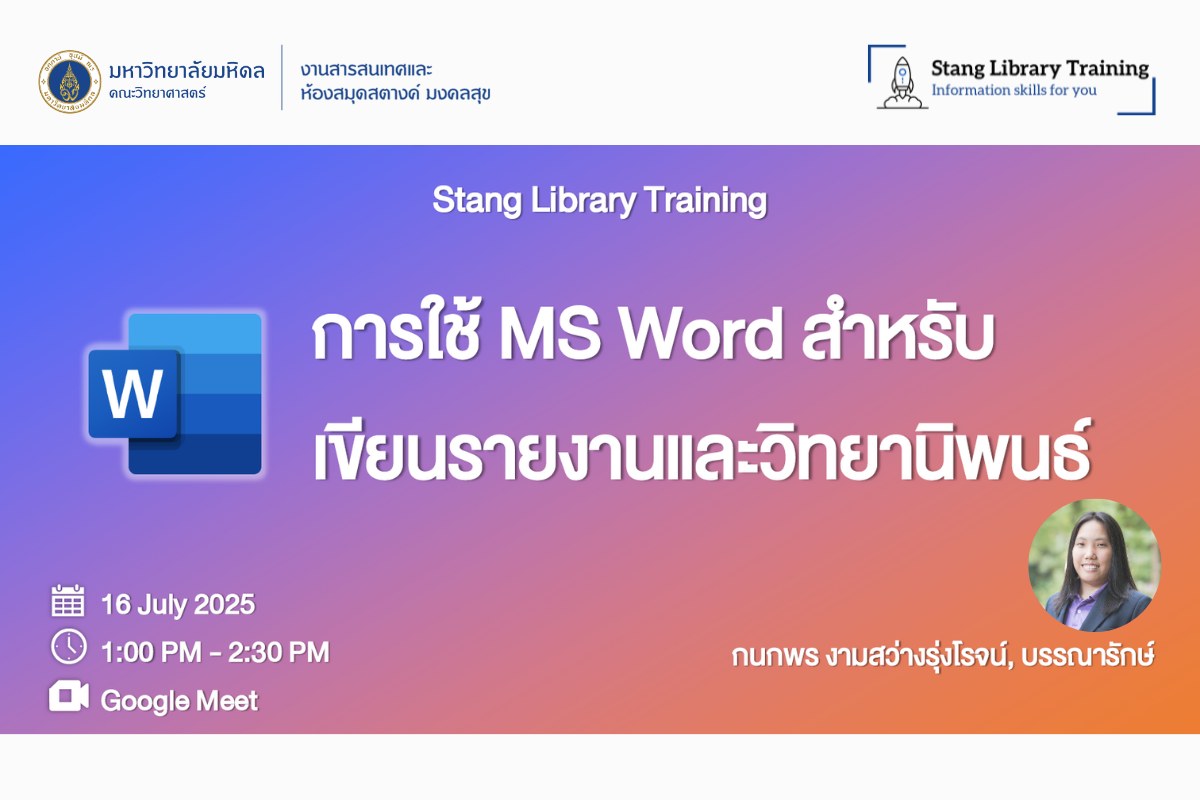 เมื่อวันที่ 16 กรกฎาคม 2568 งานสารสนเทศและห้องสมุดสตางค์ มงคลสุข จัดกิจกรรมในรูปแบบ Online หัวข้อ "การใช้ MS Word สำหรับเขียนรายงานและวิทยานิพนธ์ รุ่นที่ 5" วิทยากรโดย คุณกนกพร งามสว่างรุ่งโรจน์ ตำแหน่งบรรณารักษ์ เพื่อแนะนำการใช้โปรแกรม MS Word จัดรูปแบบของรายงานบทความวิชาการและวิทยานิพนธ์อย่างมีประสิทธิภาพ โดยใช้ข้อกำหนดวิทยานิพนธ์ของบัณฑิตวิทยาลัย มหาวิทยาลัยมหิดล เป็นตัวอย่าง มีผู้สนใจเข้าร่วมกิจกรรม 34 ท่าน