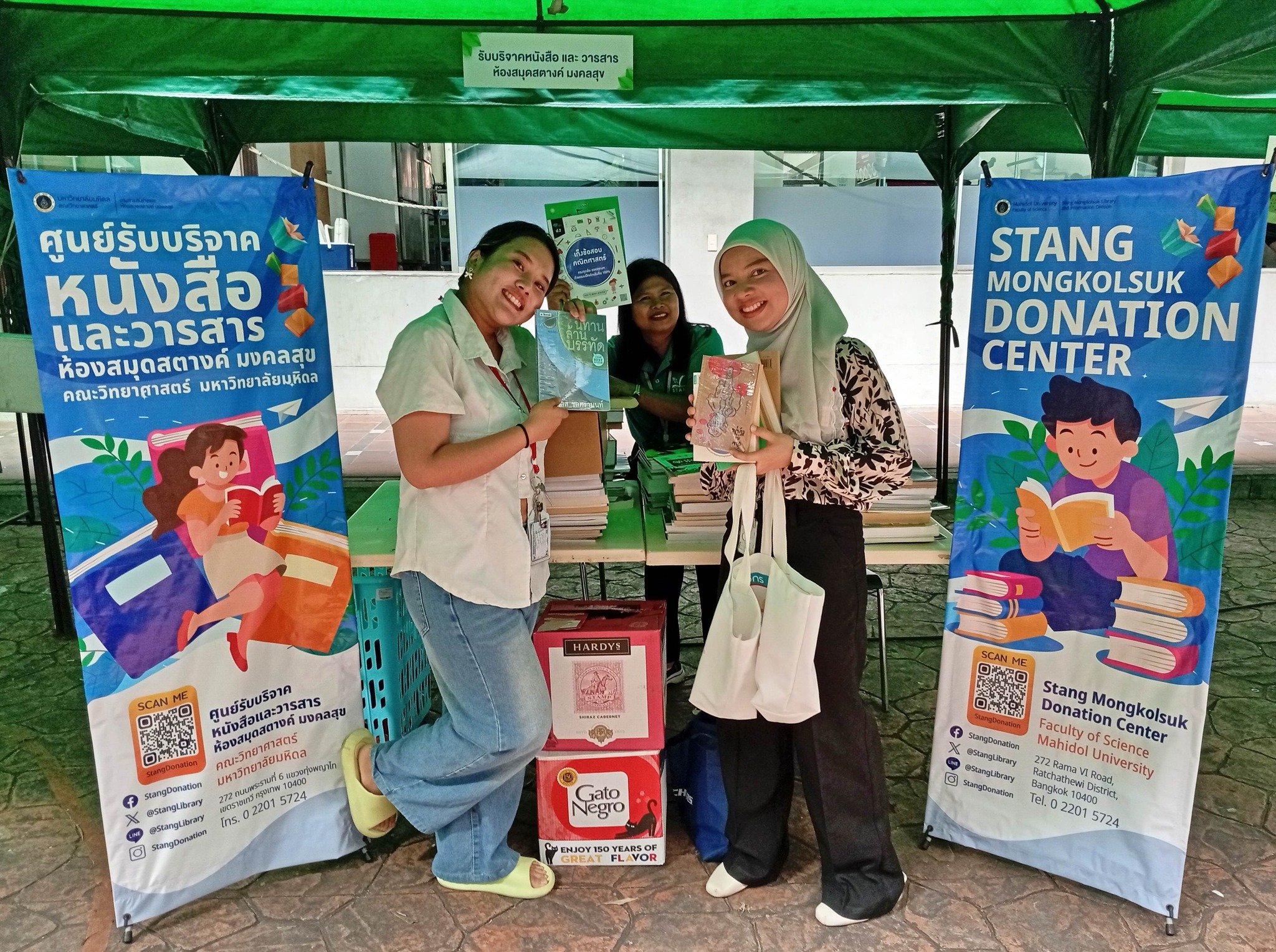 วันที่ 4 กรกฎาคม พ.ศ. 2568 ศูนย์รับบริจาคหนังสือและวารสาร ห้องสมุดสตางค์ มงคลสุข ร่วมออกบูธรับบริจาคหนังสือและวารสารในงานวันสิ่งแวดล้อมโลก ประจำปี 2568 "Say no to plastic, say yes to green" ณ ลานควินิน คณะเวชศาสตร์เขตร้อน มหาวิทยาลัยมหิดล โดยได้รับเกียรติจาก รศ. นพ.วีระพงษ์ ภูมิรัตนประพิณ คณบดีคณะเวชศาสตร์เขตร้อน, ผศ ดร. นายแพทย์ธีระ กุศลสุข รองคณบดีฝ่ายสวัสดิการและกิจการพิเศษ และผศ ดร.ธรรมณิษฐ์พล เด่นเพชรกุล ผู้ช่วยคณบดีฝ่ายสิ่งแวดล้อม เป็นผู้มอบหนังสือและวารสารที่ได้รับบริจาคในงานแก่ศูนย์รับบริจาคฯ