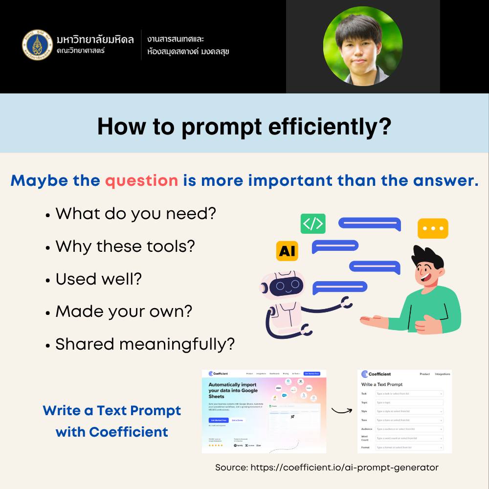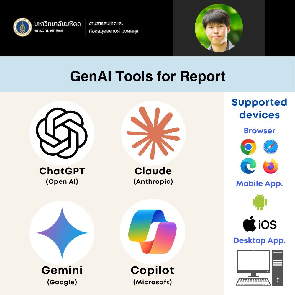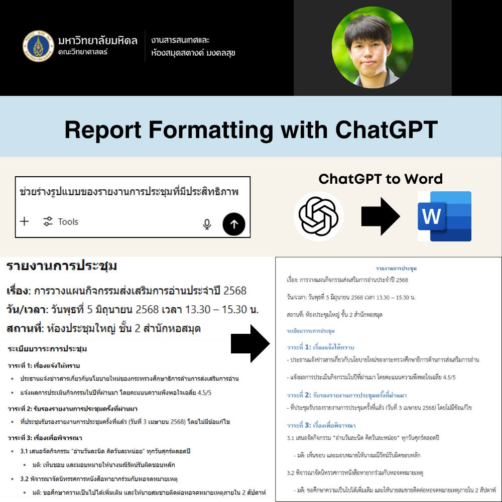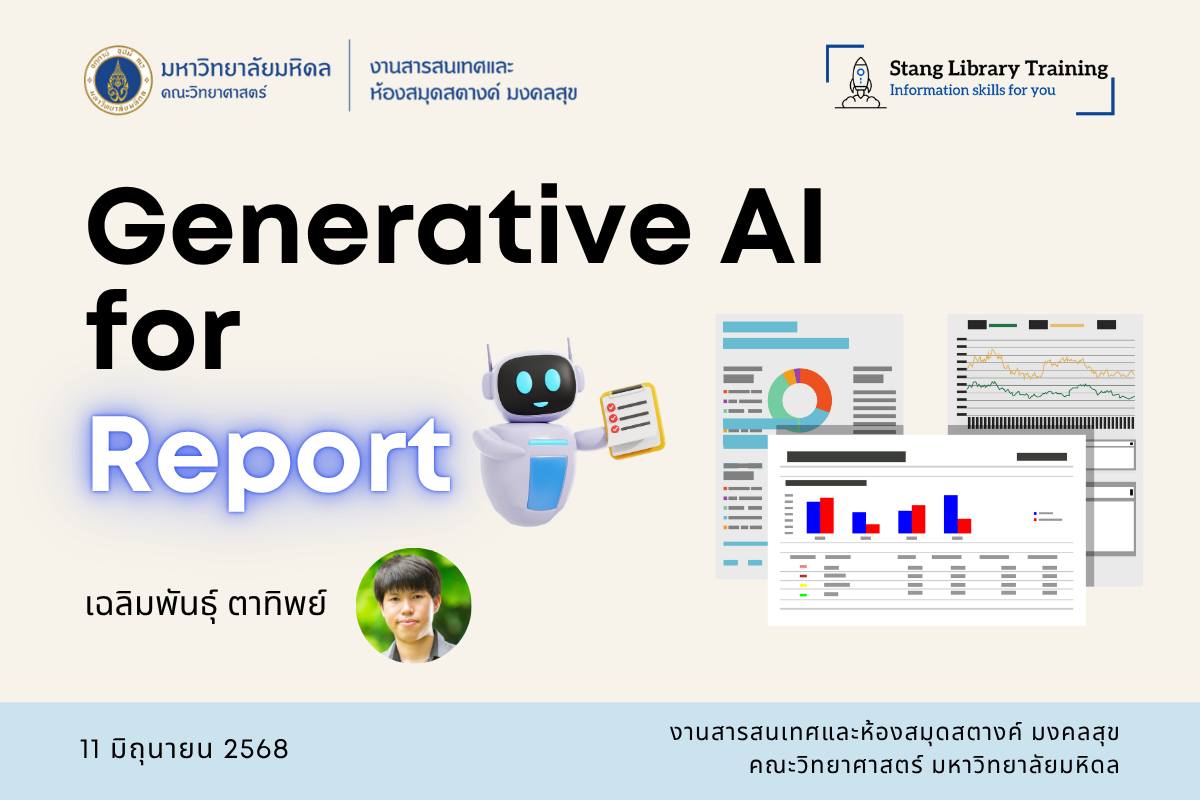 เมื่อวันที่ 11 มิถุนายน 2568 งานสารสนเทศและห้องสมุดสตางค์ มงคลสุข จัดกิจกรรมในรูปแบบ Online หัวข้อ "การประยุกต์ใช้ Generative AI เพื่อการเขียนและสรุปรายงาน" วิทยากรโดย คุณเฉลิมพันธุ์ ตาทิพย์ ตำแหน่งบรรณารักษ์ เพื่อแนะนำ Generative AI ต่าง ๆ ที่จะเข้ามาช่วยเพิ่มประสิทธิภาพในการเขียนและสรุปรายงาน ลดขั้นตอนการทำงานซ้ำซ้อน ตรวจสอบความถูกต้องของข้อมูล และนำเสนอเทคนิคการเขียนรายงานแบบต่าง ๆ ผ่านการเขียนคำสั่ง (Prompt) มีผู้สนใจเข้าร่วมกิจกรรม 56 ท่าน