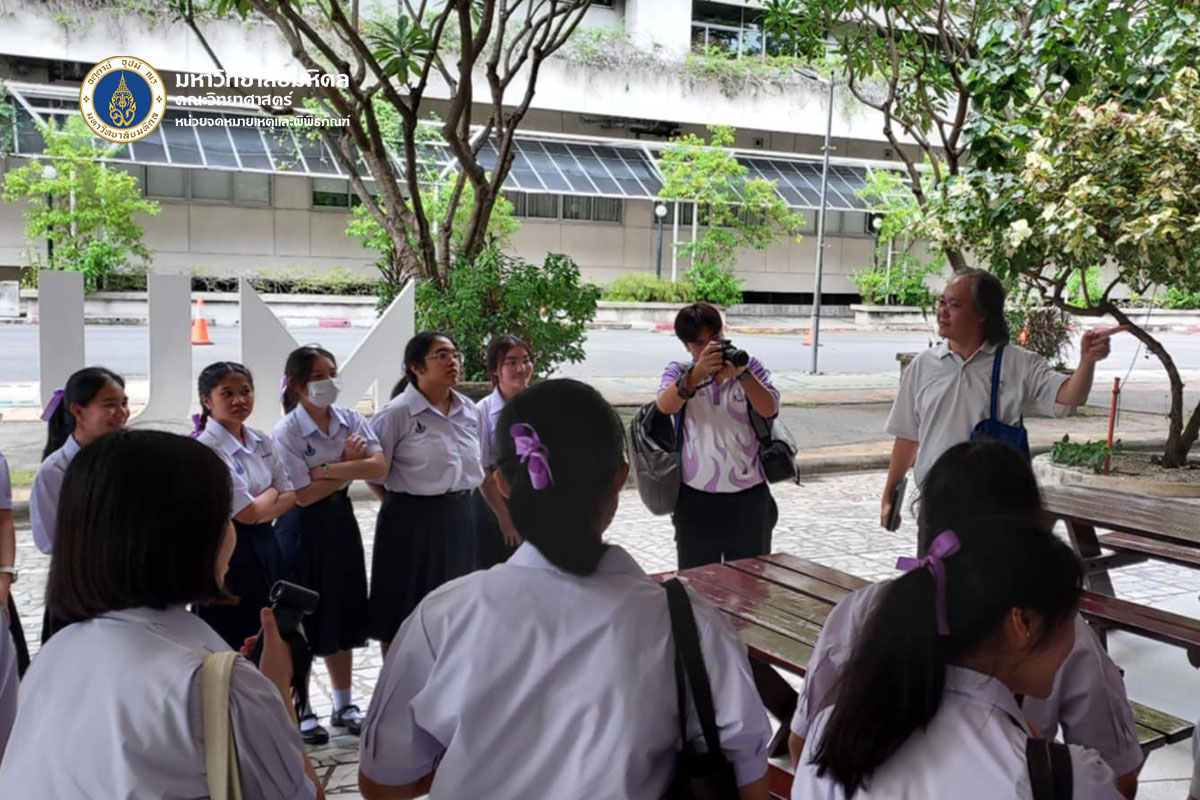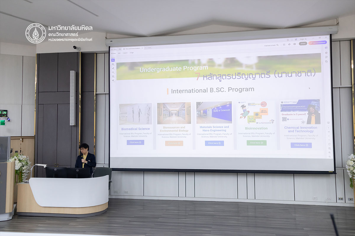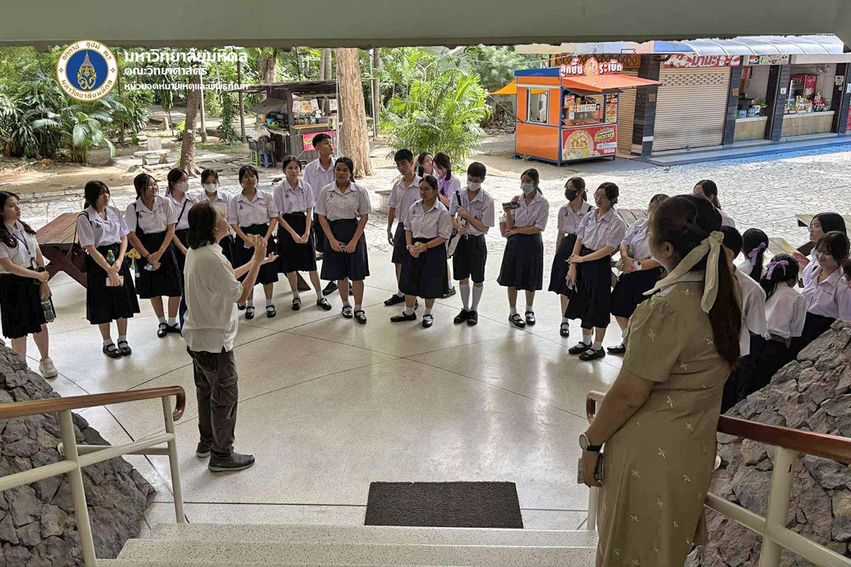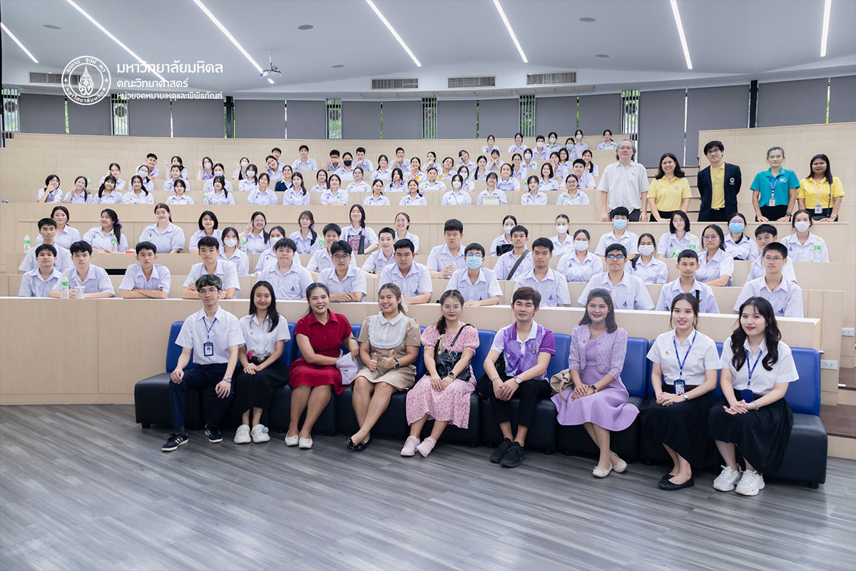 วันจันทร์ที่ ๒๓ มิถุนายน พ.ศ. ๒๕๖๘ คณะวิทยาศาสตร์ มหาวิทยาลัยมหิดล ต้อนรับคณะนักเรียนและอาจารย์จากโรงเรียนสิรินธรราชวิทยาลัย จังหวัดนครปฐม จำนวน ๑๐๔ ท่าน เข้าเยี่ยมชมหลักสูตรการเรียนการสอนของคณะวิทยาศาสตร์ เพื่อเป็นข้อมูลประกอบการตัดสินเข้าศึกษาต่อ โดยได้รับเกียรติจาก ดร.ธน เตชะเลิศไพศาล ผู้ช่วยคณบดีฝ่ายสารสนเทศ บรรยายสรุปเกี่ยวกับหลักสูตรต่าง ๆ