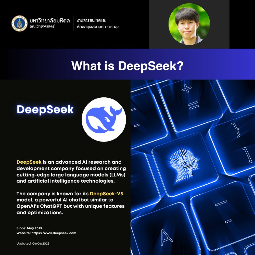 เมื่อวันที่ 4 มิถุนายน 2568 งานสารสนเทศและห้องสมุดสตางค์ มงคลสุข จัดกิจกรรมในรูปแบบ Online หัวข้อ "การประยุกต์ใช้ Generative AI ด้วย DeepSeek" วิทยากรโดย คุณเฉลิมพันธุ์ ตาทิพย์ ตำแหน่งบรรณารักษ์ เพื่อแนะนำแพลตฟอร์ม DeepSeek หนึ่งใน Generative AI ที่จะเป็นผู้ช่วยตอบคำถาม รวบรวมข้อมูล เขียนบทความ วิเคราะห์ข้อมูล เปรียบเทียบข้อมูล และสรุปผลข้อมูล ผ่านการเขียนคำสั่ง (Prompt) พร้อมอัปเดตฟีเจอร์ใหม่ ๆ มีผู้สนใจเข้าร่วมกิจกรรม 41 ท่าน