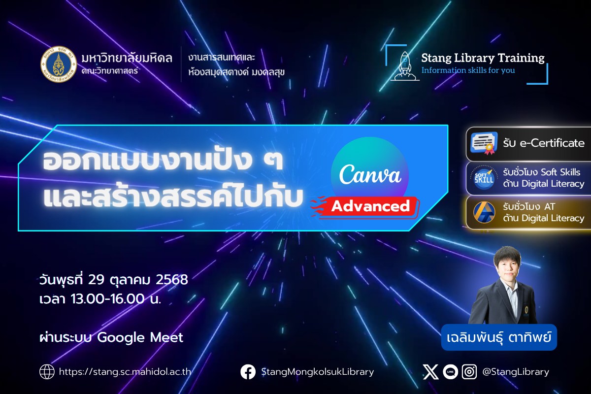 เมื่อวันที่ 29 ตุลาคม 2568 งานสารสนเทศและห้องสมุดสตางค์ มงคลสุข จัดกิจกรรม Stang Library Training (Special) ในรูปแบบ Online หัวข้อ "ออกแบบงานปัง ๆ และสร้างสรรค์ไปกับ Advanced Canva" เพื่อแนะนำการใช้ Canva อย่างเต็มประสิทธิภาพ เรียนรู้เทคนิคออกแบบอย่างมืออาชีพ พร้อมลงมือปฏิบัติจริง พร้อมมอบ e-Certificate, ชั่วโมง Soft Skills, และชั่วโมง AT ด้าน Digital Literacy แก่ผู้เข้าร่วมกิจกรรม วิทยากรโดย คุณเฉลิมพันธุ์ ตาทิพย์ ตำแหน่งบรรณารักษ์ มีผู้สนใจเข้าร่วมกิจกรรม 118 ท่าน