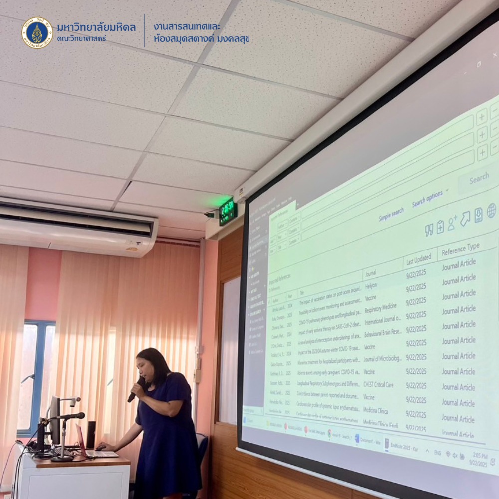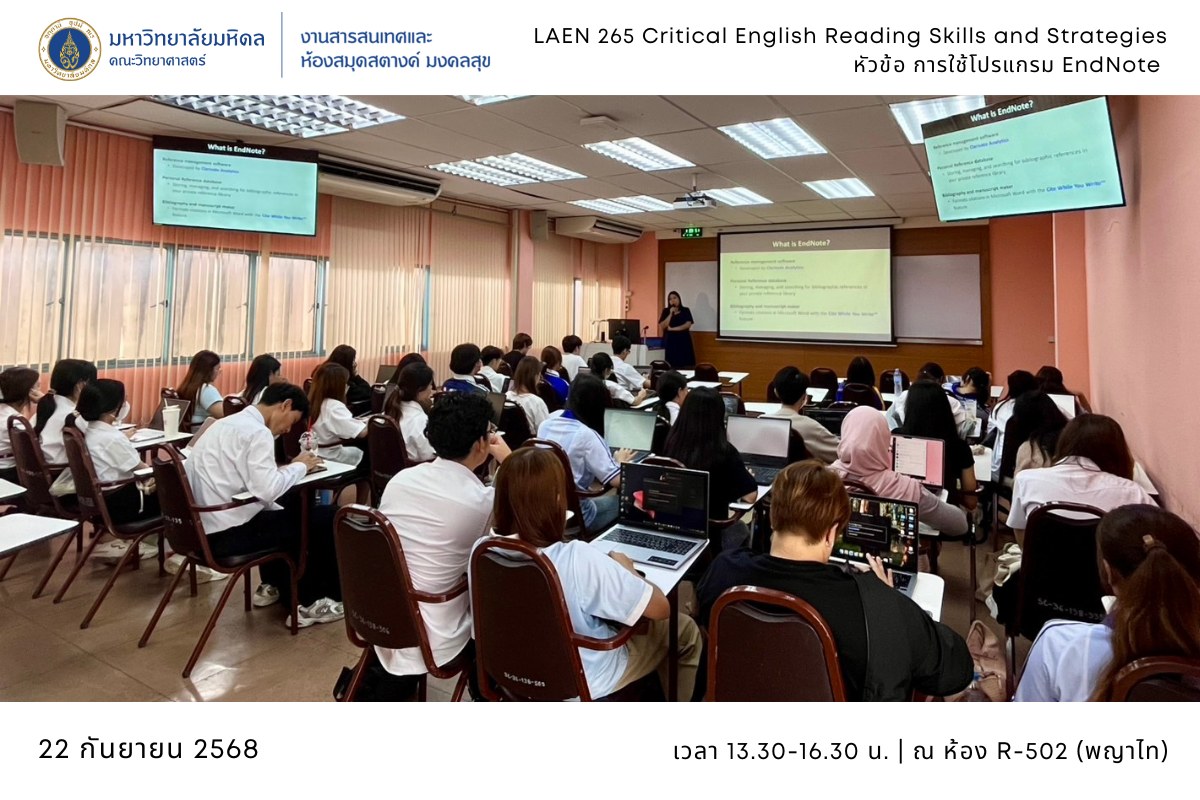 เมื่อวันที่ 22 กันยายน 2568 คุณกนกพร งามสว่างรุ่งโรจน์ พร้อมทีมบรรณารักษ์ห้องสมุดสตางค์ มงคลสุข เป็นวิทยากรพิเศษ ในการบรรยายและฝึกปฏิบัติ หัวข้อ "การใช้โปรแกรม EndNote" รายวิชา LAEN 265 Critical English Reading Skills and Strategies ของคณะศิลปศาสตร์ มหาวิทยาลัยมหิดล ประจำภาคการศึกษาต้น ปีการศึกษา 2568 ให้แก่นักศึกษาคณะวิทยาศาสตร์ ชั้นปี 2 จำนวน 50 คน ณ ห้อง R-502 อาคารวิจัย คณะวิทยาศาสตร์ มหาวิทยาลัยมหิดล พญาไท